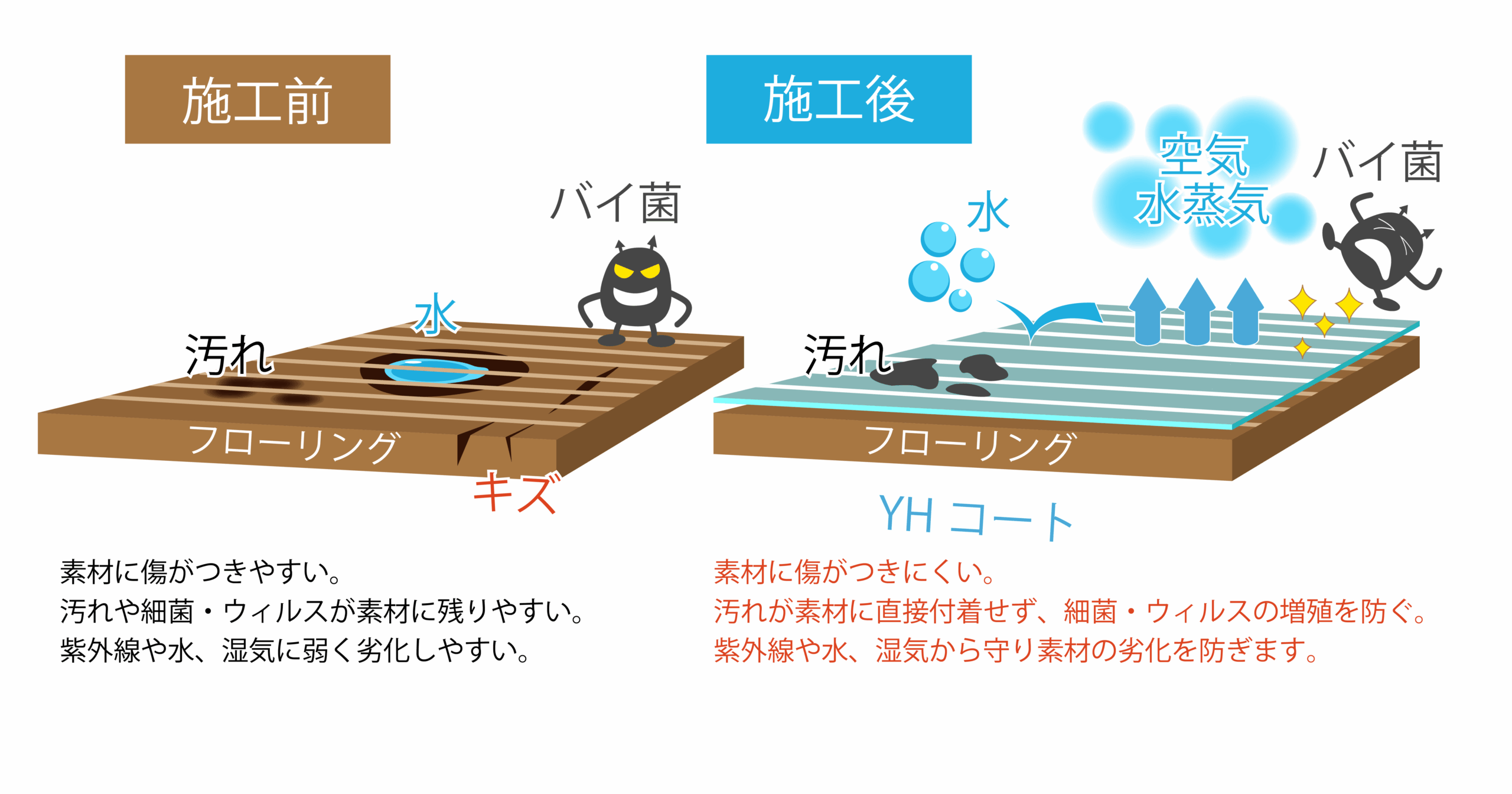 室内フローリングの場合、一度の施行で、高耐久のコーティングを10年維持できます。
